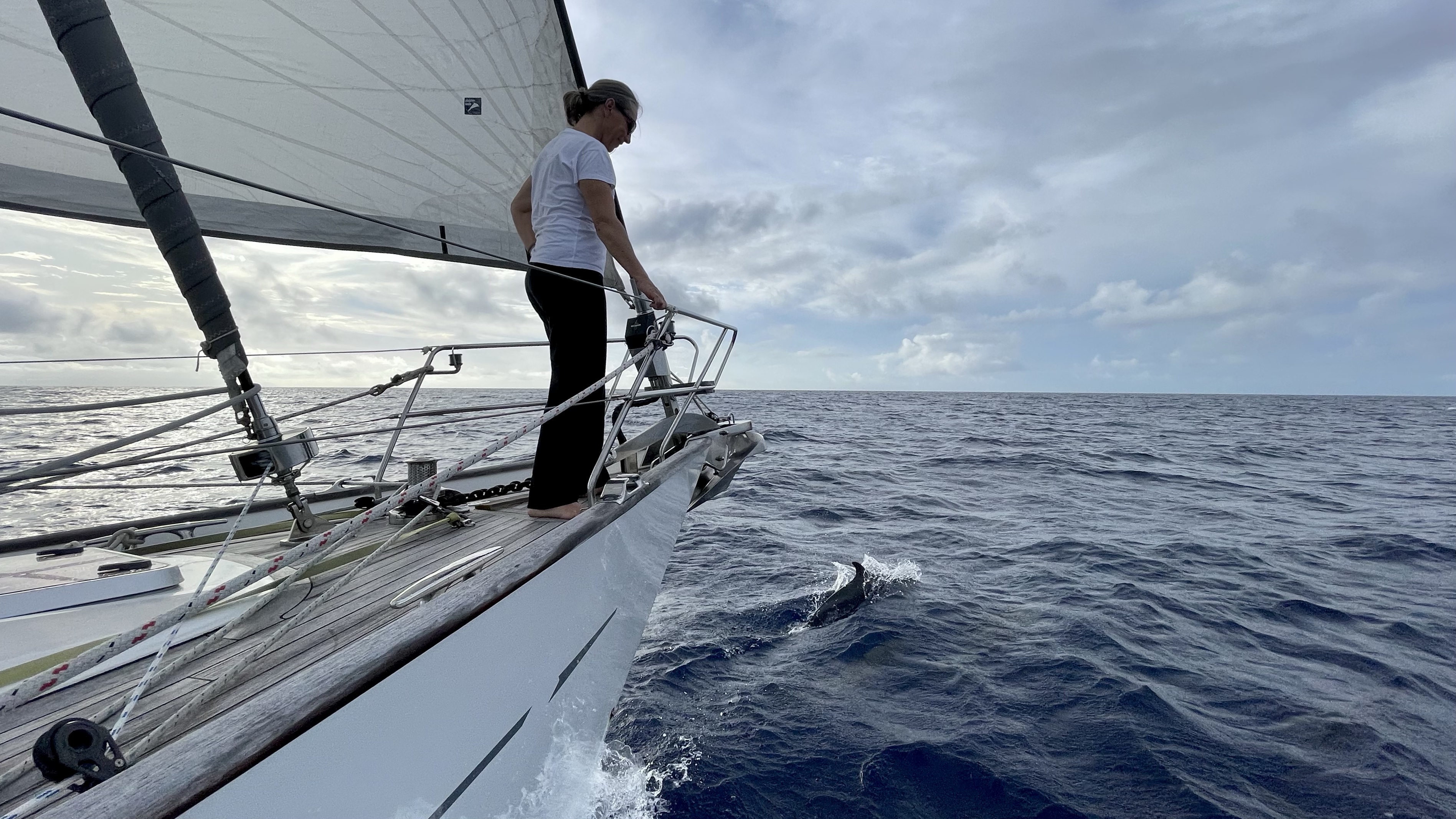 Vinden dog ut så det fick bli motorgång igen. På håll såg vi Fijis höga gröna öar och vi blev eskorterade av en stor flock delfiner. Vattentemperaturen var nu 27 grader så man behövde inte mycket kläder på nattpassen.