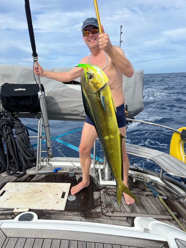 Vi hade varje eftermiddag kontakt med de andra båtarna via SSB-radion. Det är kul att höra var de andra ligger, vad de har för väder eller om det hänt något särskilt under dagen. Att någon hade sett en val och andra hade fått upp en guldmakrill var typiska händelser som rapporterades. Vi ville också få upp guldmakrill så vi riggade upp våra spön och släppte ut reven och väntade på napp. Den dagen fick vi upp tre skapliga guldmakrillar eller mahimahi som de också heter så nu hade även vi något att rapportera. När båten gungar och kränger är det lite jobbigt att sitta på knä på akterdäck och filea stora fiskar men det är väl värt mödan när både kyl och frys är fulla med god fisk.