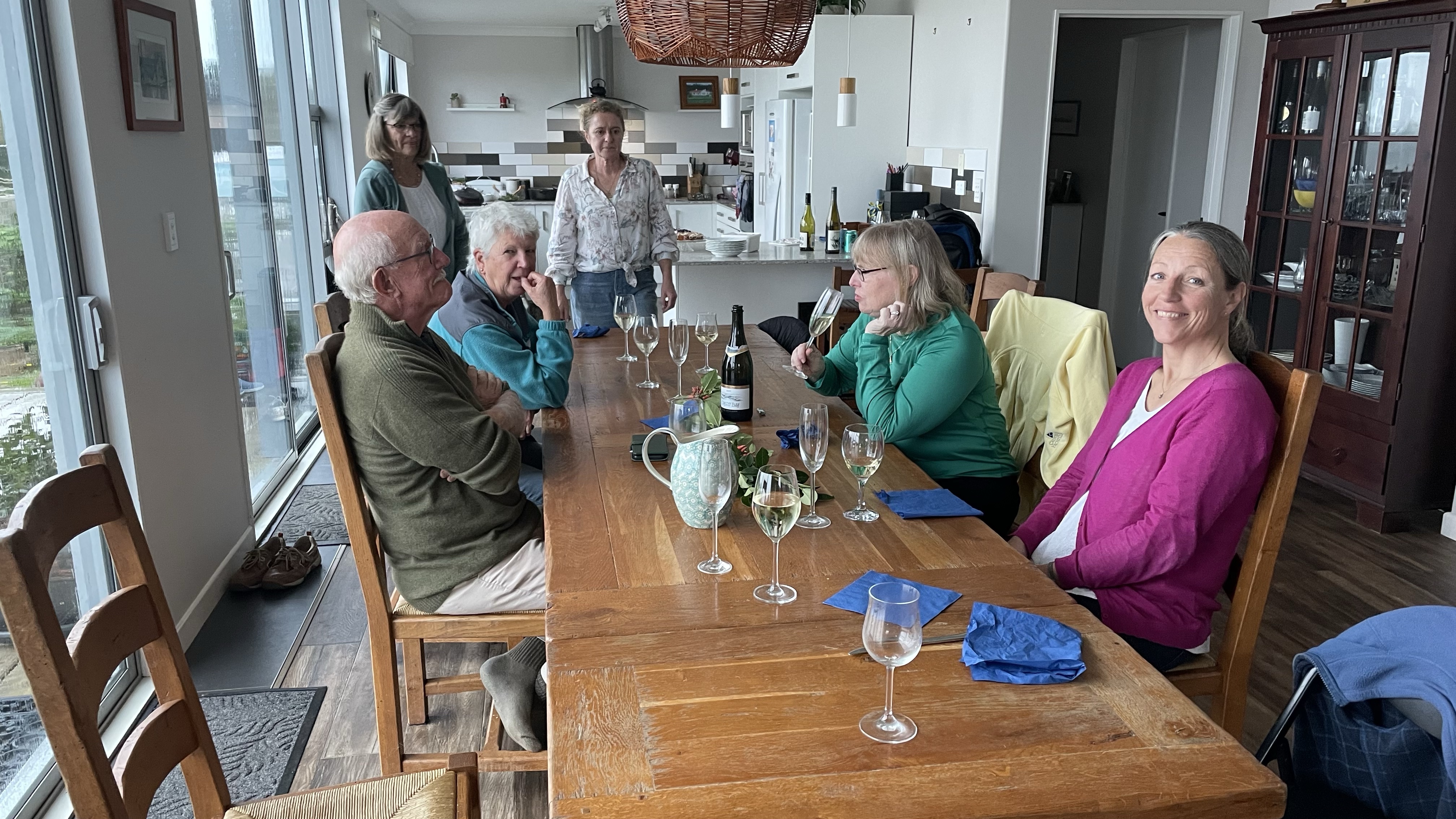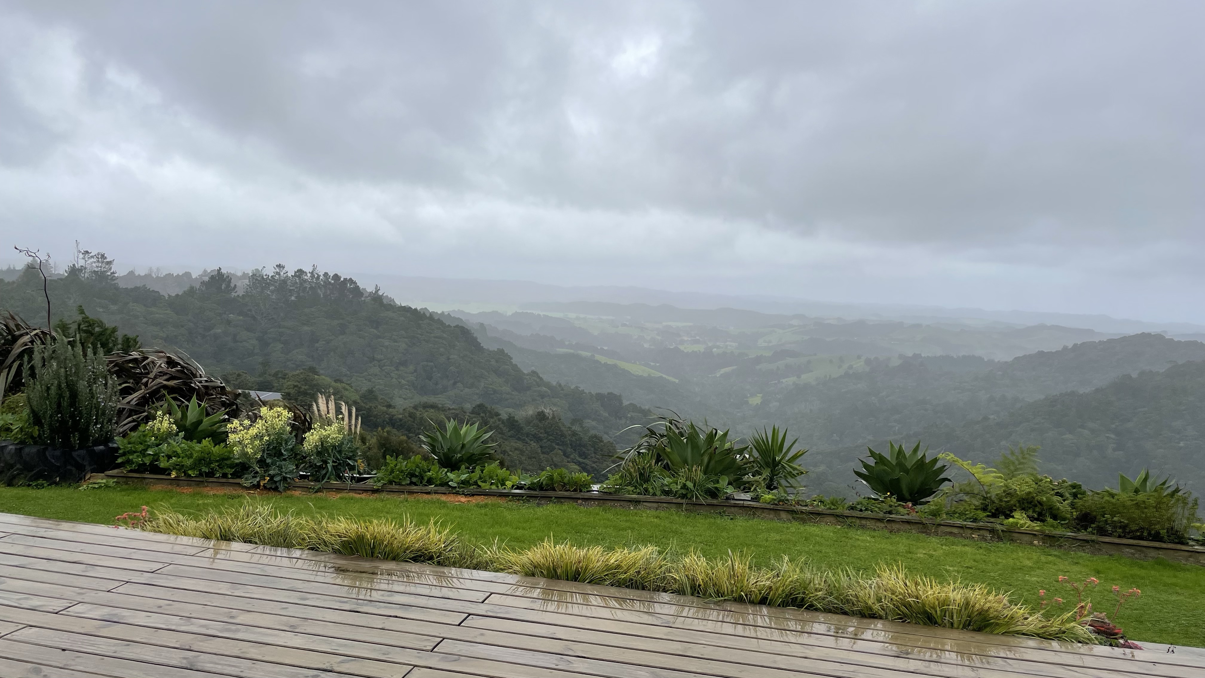 En dag blev vi tillsammans med några andra seglare inbjudna på middag hemma hos Sharron. Hon har bott i Sverige och kan därför prata bra svenska. Sharron bor uppe i bergen ovanför Whangarei och från hennes hus har man en fantastisk utsikt över området. Tyvärr började det att spöregna redan när vi kom men den utsikt vi såg var fin.