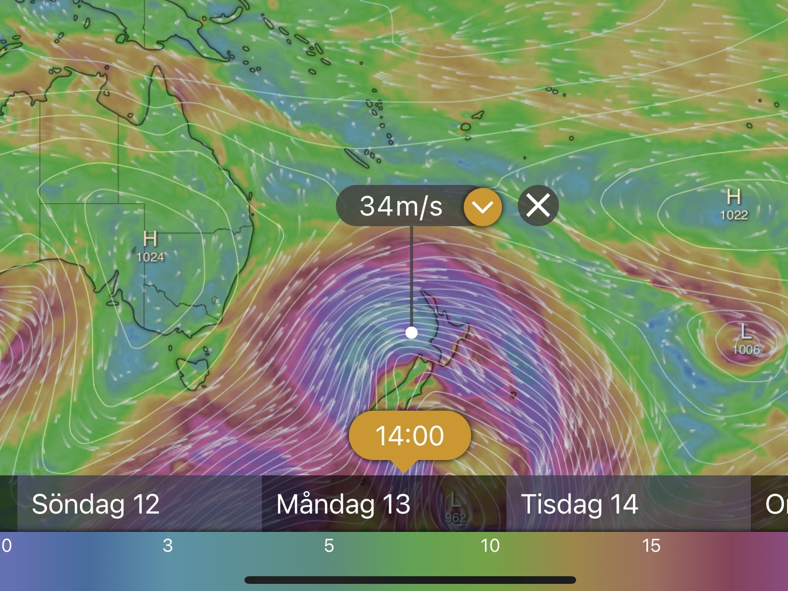 Någon dag efter att vår kyl åter var installerad i båten så fanns ett möjligt väderfönster för att segla mot Fiji. Det var inte något riktigt bra fönster, vinden skulle vara hård och sjön grov de första dagarna för att sedan följas av ett stort stiltjebälte. Dessutom var vi inte riktigt färdiga, varken med proviantering eller mentalt. Den norska båten Mais Uma och några andra båtar vi känner stack iväg men vi valde att stanna kvar. Efteråt har vi hört att en båt bröt bommen, en annan fick dreja bi i hårt väder och 6 meter vågor. Mais Uma, som är en snabb katamaran, seglade fort de första dagarna och kom upp en bra bit norrut och slapp kanske på så sätt det värsta. De gick sedan för motor till Minerva Reef och hade en härlig tid där med snorkling och lobsterfiske. Vi som stannat kvar såg fram emot nästa väderfönster som skulle komma en knapp vecka senare enligt väderprognosen. Så blev det inte. När tiden för avfärd närmade sig försämrades prognosen och det blev omöjligt att ge sig av. Man vill lämna Nya Zeeland direkt efter att ett lågtryck har passerat. På baksidan av lågtrycket är det sydliga vindar vilket är bra om man ska segla norrut. I år har lågtrycken kommit oftare och på en mer nordlig bana än normalt vilket innebär att man bara hinner segla några dagar innan nästa lågtryck kommer och ger hård nordlig vind igen. Här är några exempel på hur man inte vill att prognosen ska se ut.