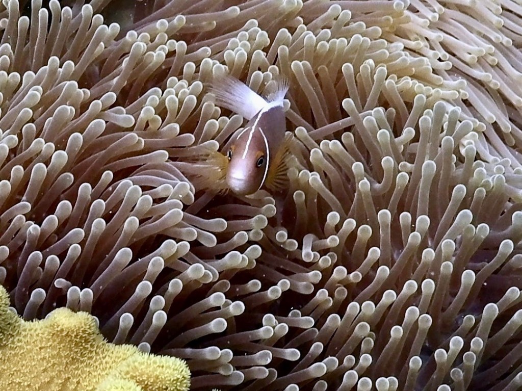När vinden lagt sig tog vi jollen ut genom passet för att dyka på utsidan av korallrevet. Andreas och Helene på Wapiti körde ut i deras jolle och när vi alla dykt ner tog Cecilia deras jolle på släp och väntade på oss vid passets insida. Cecilia har sedan tidigare fått titeln surface manager. Här på utsidan av revet var korallerna verkligen fina med mängder av fiskar. Vi spanade då och då ut mot det mer än tusen meter djupa vattnet utanför oss i hopp om att en nyfiken hammarhaj skulle dyka upp men tyvärr såg vi ingen.