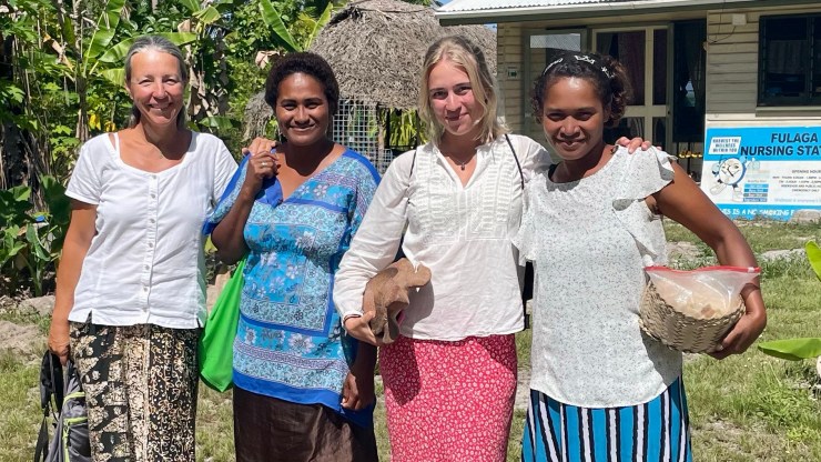 En timme innan Olivia (Cecilias systerdotter) skulle landa blev Cecilia avsläppt på stranden och promenerade mot flygplatsen. När hon kom ut på huvudvägen stannade en bil och frågade om hon ville åka med. Det var två snälla poliser som också skulle dit som gav henne skjuts. Planet landade på utsatt tid och med kavarötter i handen klev Olivia ut ur det lilla trånga planet. Rötterna hade vi beställt från marknaden i Suva för att ha till sevusevubesöken. På tillbakavägen fick de skjuts på ett flak. Jocke hämtade upp sedan upp dem på stranden och vid kaffet delade Olivia ut presenter som hon tagit med sig från Sverige. Vi blev härligt bortskämda med bland annat saltlakrits och piptobak. Den dagen stannade vi kvar på ankringen och snorklade på revet. Dagen efter seglade vi iväg tidigt på morgonen för att hinna ner till nästa ö. Redan en stund efter att vi lämnat Lakeba fångade vi en skapligt stor guldmakrill och strax efter en gulfenad tonfisk. De blev snabbt fileade och inlagda i kylen. I takt med att vi seglade söderut försvann mottagningen från våra telefoner och till slut var vi helt utan uppkoppling och det skulle dröja nästan två veckor innan vi hade internet igen.