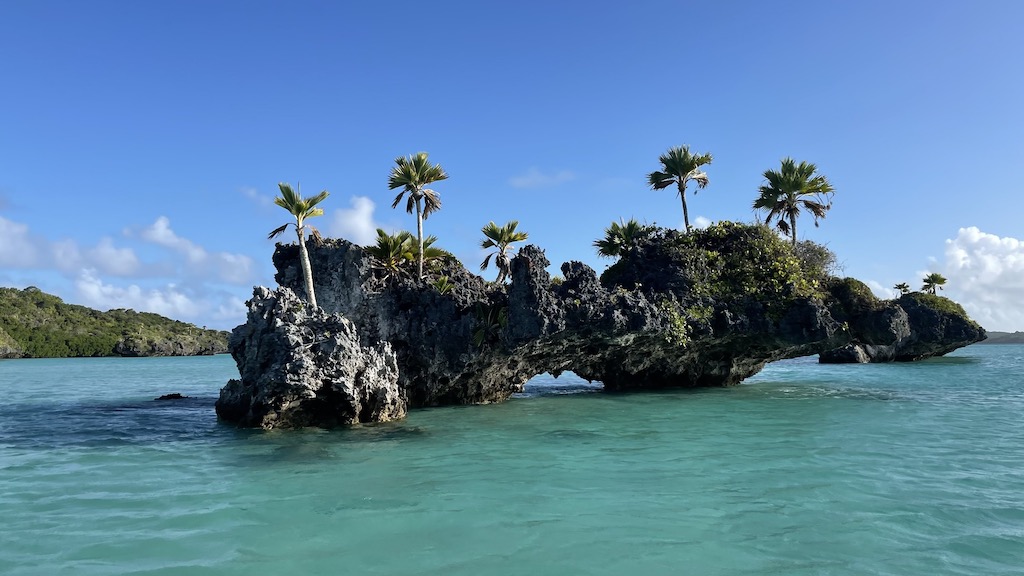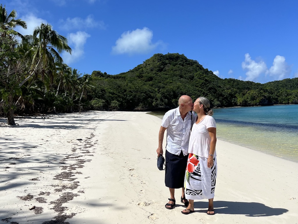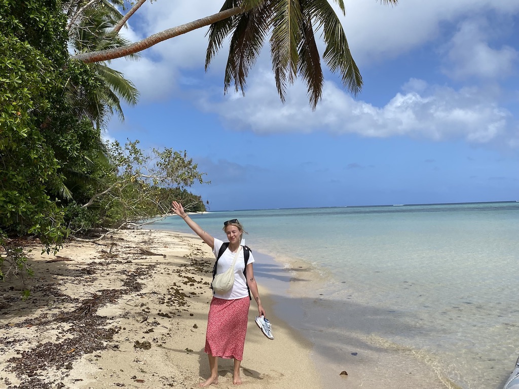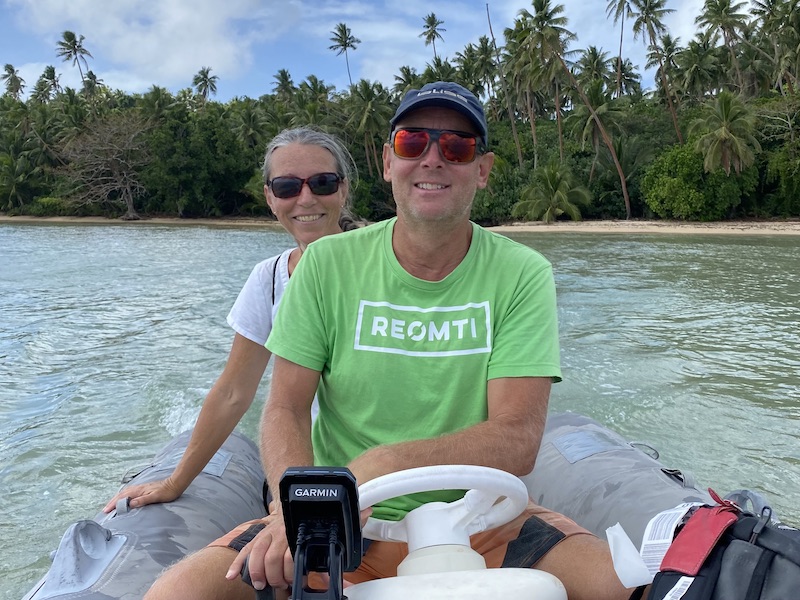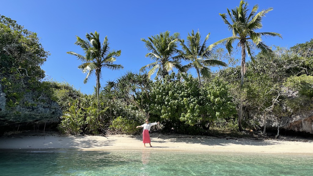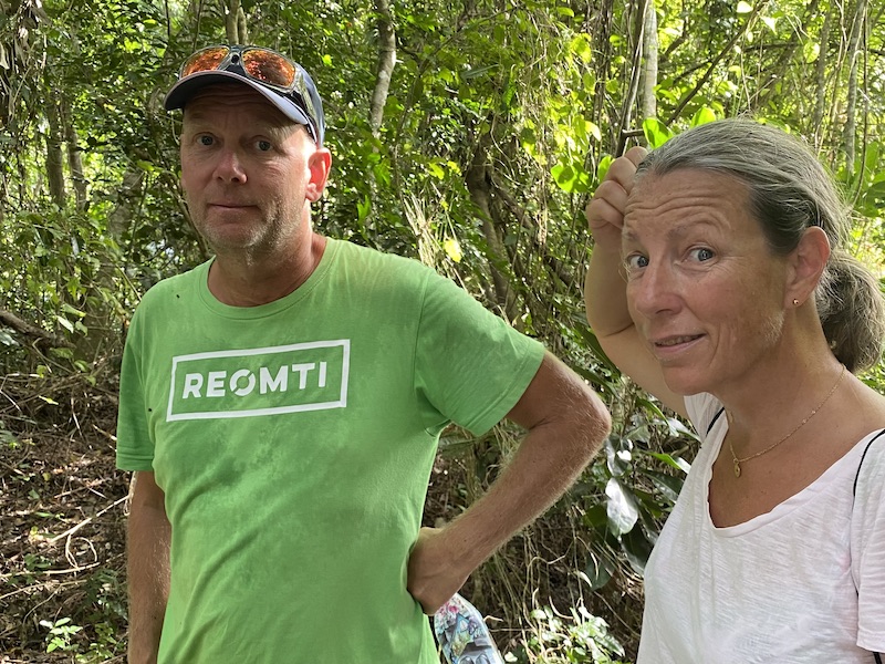 Väl framme på flygplatsen (en landningsbana på ett fält med ett litet skjul som terminal) kändes det skönt när jag såg Cillan glatt stå och vinka. Som tur var fick vi skjuts av några snälla öbor på deras flak. En liten promenad genom djungeln så var vi framme på stranden och där kom Jocke i jollen vinkades. Det var ett fint mottagande!