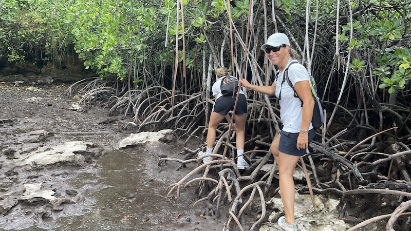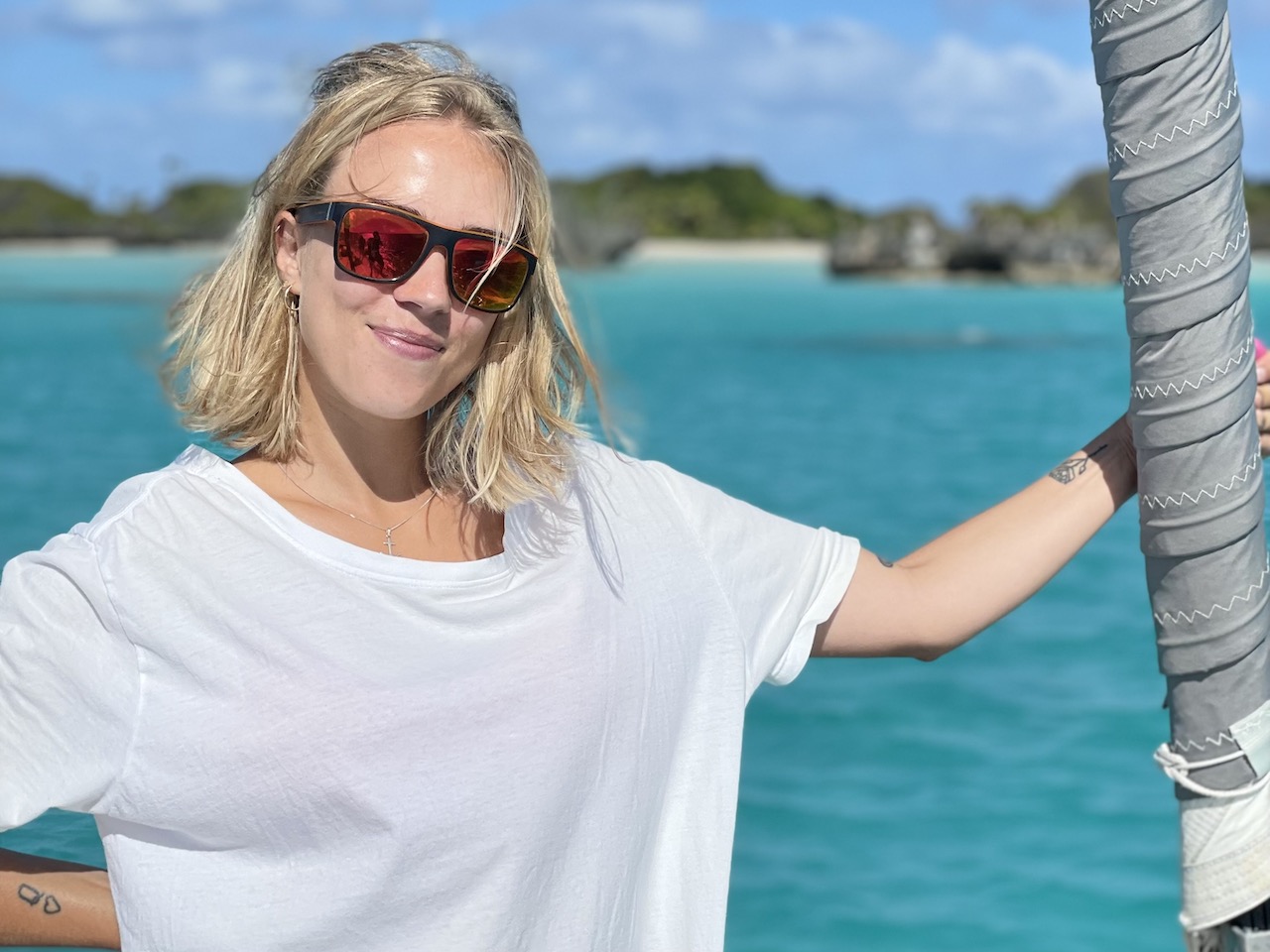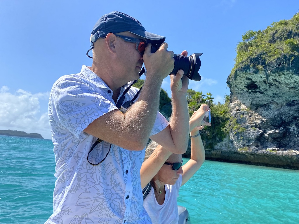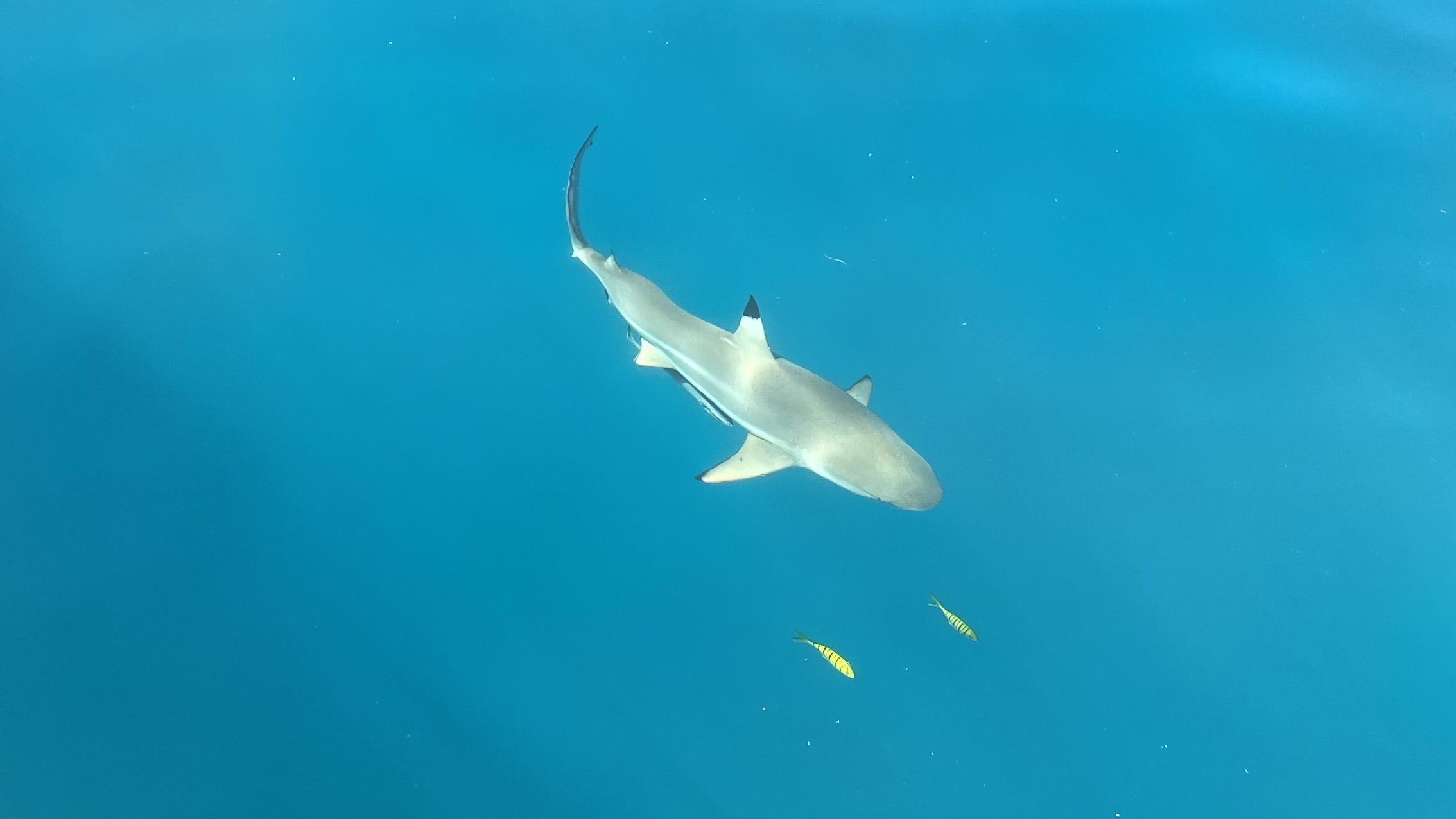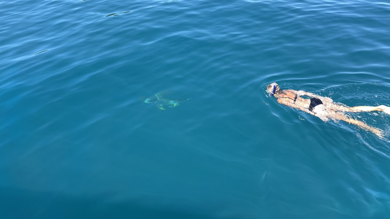 En annan dag ankrade vi ensamma i en vik och så fort vi släppt ankare kom ett gäng hajar, blacktips, och simmade runt båten. Jocke, galen som han är, tvingade i mig i vattnet så jag kunde simma med dom. Allt för bilden tänkte jag och hoppade i. Även om jag visste att dom är harmlösa steg pulsen och jag svängde runt med huvudet hela tiden för att inte bli överraskad av en haj som kom smygandes bakom mig. Efter en stunds ångestfyllt simmande fick det räcka, vi hade lyckats fota när hajen var hyfsat nära så jag var nöjd ändå.