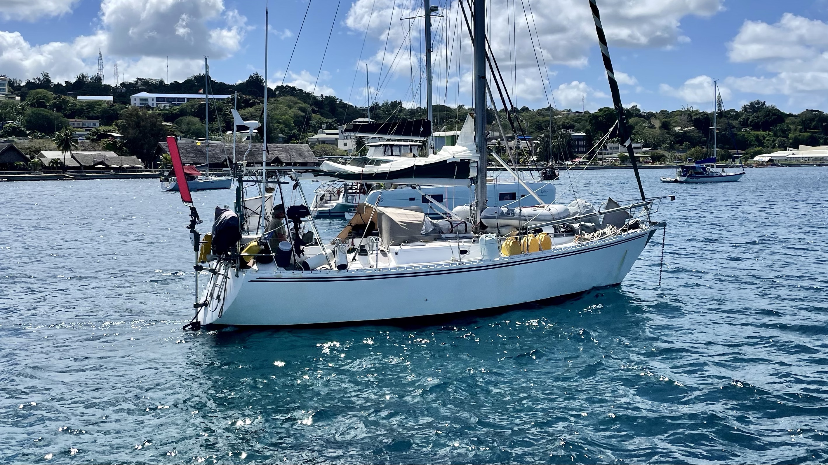 Säsongen för att segla i Vanuatu började att ta slut och cyklonsäsongen närmade sig så det var dags att börja segla vidare. Vi steg upp före soluppgången för vi ville hinna segla de 85 sjömilen från Maskelyne Island till huvudstaden Port Vila medan det var ljust. Förutom i början och slutet av färden hade vi fin vind så efter 11,5 timmar ankrade vi inne i staden, en stund innan det blev mörkt. Här låg Wapiti men även den norska båten 2K. Det var kul att träffa Kjell igen och att han är tillbaka och seglar efter en tid hemma i Norge. På morgonen efter kom Barry ”the old seadog” inseglande och ankrade. Barry är en youtuber och hans filmer ses av upp emot hundratusen personer. Han var en av våra inspiratörer och vi tittade ofta på hans filmer innan vi själva seglade i väg 2018. Att vi skulle komma ifatt honom trodde vi inte då men när covid slog till fastnade han i Nya Zeeland och låg i samma marina som vi senare kom till.
