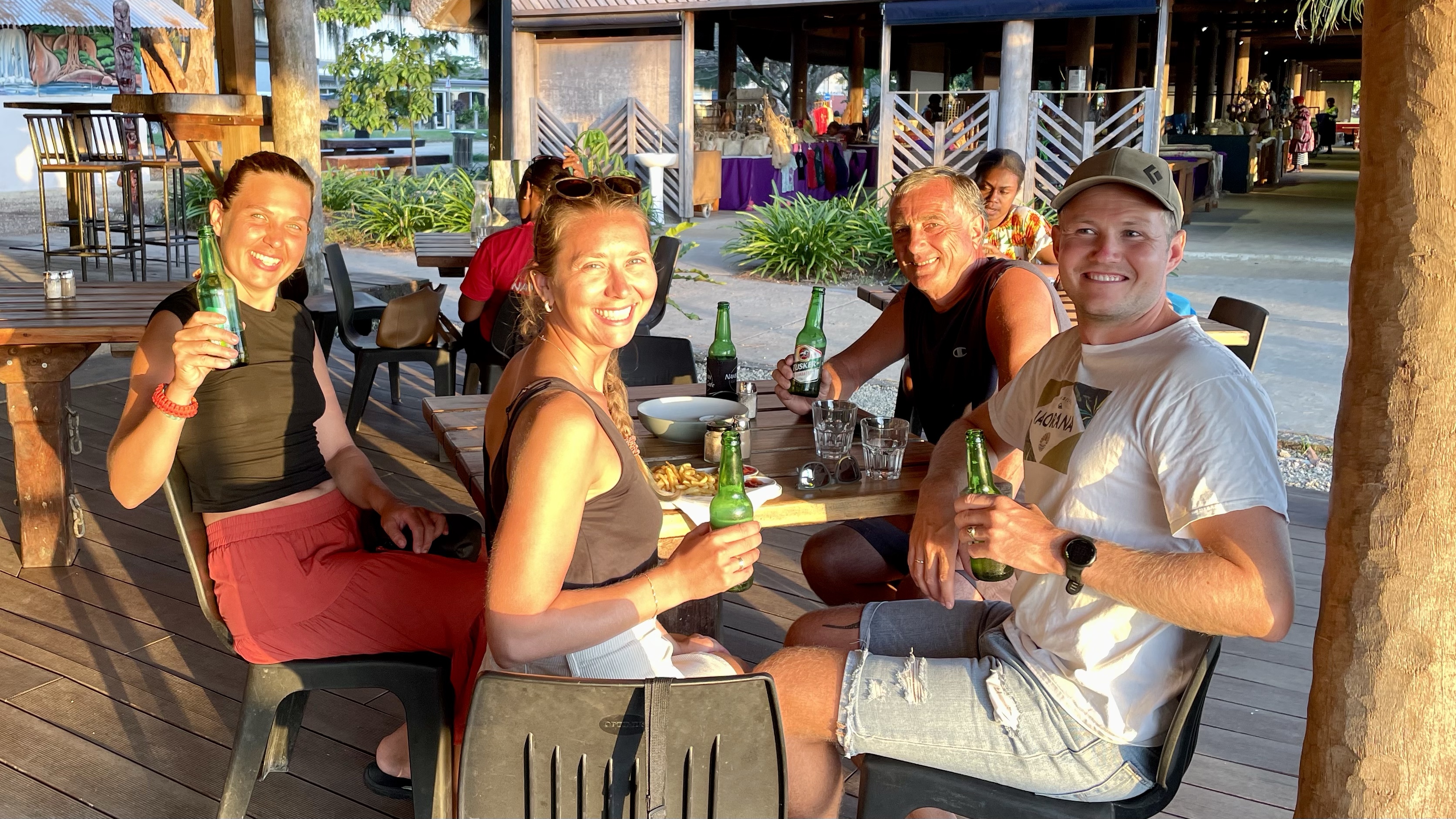 Vi blev inte långvariga i Port Vila för prognosen såg bra ut att segla söderut till Nya Kaledonien. Vi hade tänkt att mellanlanda i några veckor där innan vi fortsatte mot Australien. Utklareringen hos tullen kan man skriva ett eget kapitel om för det tog oss två besök, fyra timmar och mycket tålamod innan allt var klart. När man klarerat ut har man 24 timmar på sig att lämna landet så vi tog en tur in till affären för att göra av med de sista kontanterna. Det blev en machete och två påsar Bongo som är ett av våra favoritsnacks. På kvällen samlades det skandinaviska gänget på en bar iland för en sundowner. Vi och Wapiti skulle segla till Nya Kaledonien dagen efter och 2K väntade på rätt vind för att segla till Tanna för att se på vulkanen.